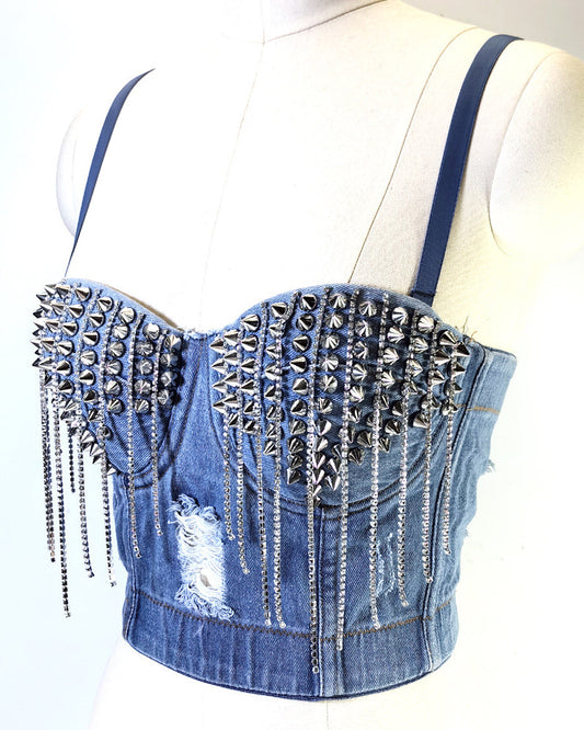 Distressed Denim Embellished Diamond Beaded Fringed Back Bandeau