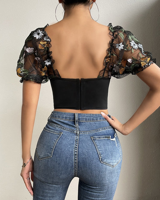 Mesh Floral Embroidery Buttoned Puff Sleeve Herringbone Crop Top