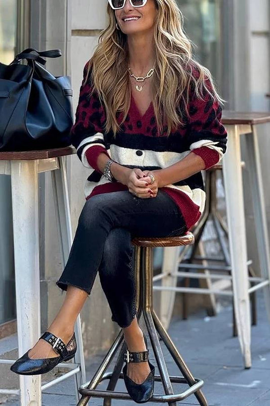 Stay Close Knit Leopard Color Block Button Up Relaxed Cardigan