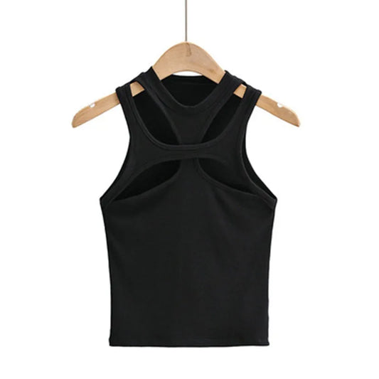 Girls New Asymmetrical Hollow Solid Color Knitted Round Neck Short-sleeved Summer Sexy Vest on The Chest