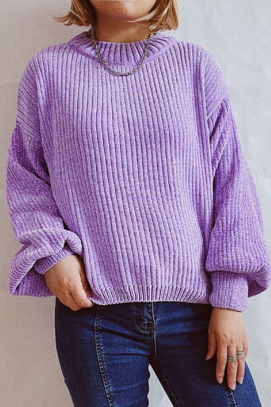 Solid Color Casual Round Neck Lantern Sleeve Short Knitted Sweater