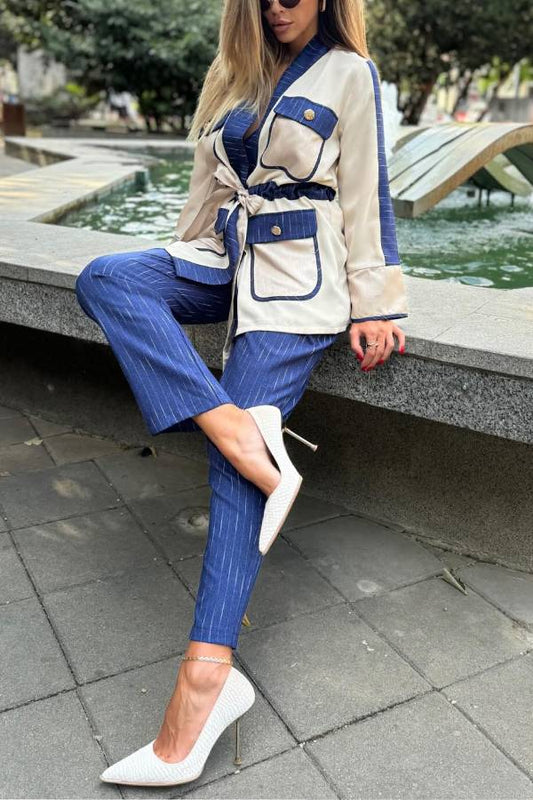 Halston Patchwork Drawstring Flap Pocket Top and Striped Elastic Waist Loose Pants Set