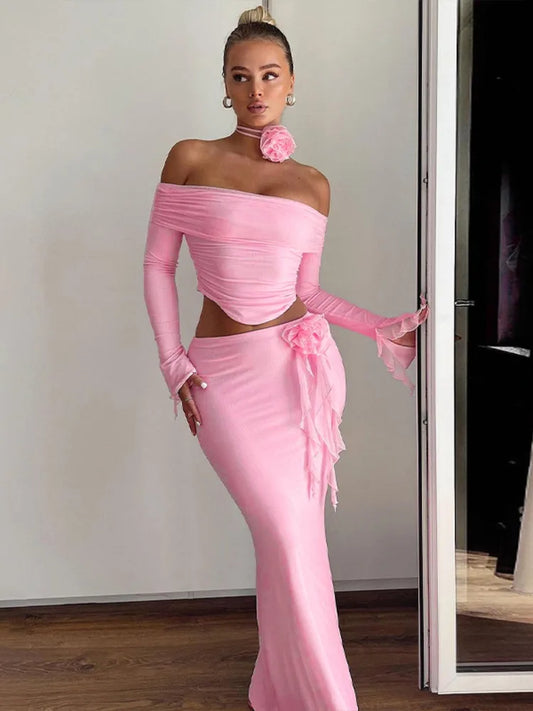 Winter New Sexy Long Sleeved Half Skirt Set For Woman 3D Flower Slim Tight Long Skirt Party Evening Dress Two Piece Set