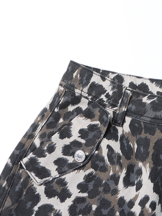 Leopard Print High-Rise Straight-Leg Cargo Pants With Pocket Jeans