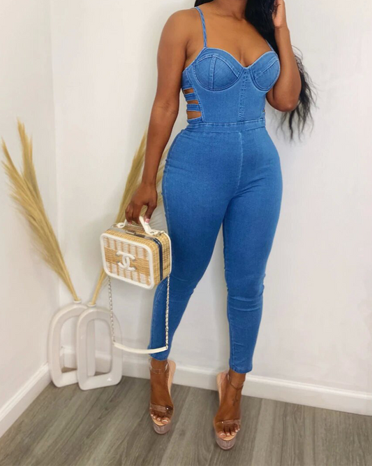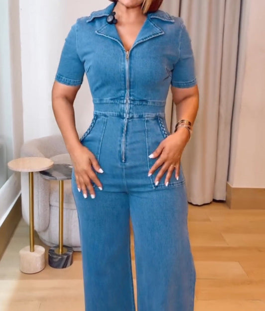 Casual Loose Straight Leg Demin Jumpsuits with Pockets
