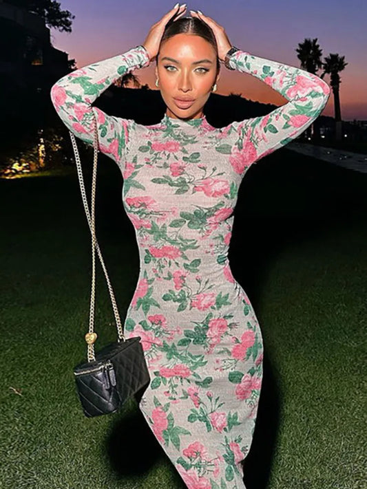Bodycon Long Sleeve Half High Collar Print Zipper Elegant Maxi Dress Women Slim High Waist Sexy Dress Ladies Outfits