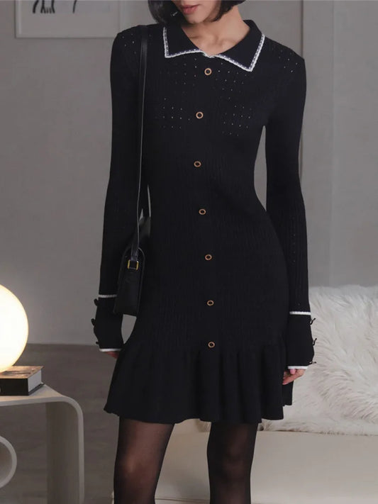 Autumn Long Sleeve Knit Dress For Women Fashion Lapel Single-btrasted Button High Waist Ruffled Mini Dress Knitwear