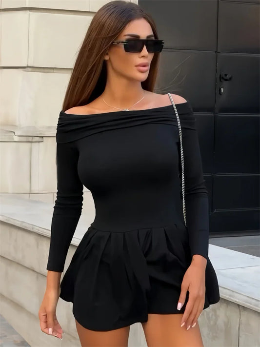 Black Off-Shoulder High Waist Mini Dress Women’s Pleated Fashion Patchwork Slim Backless Dress Female Sexy Dress Autumn