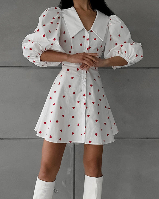 Cotton And Linen Puff Sleeve High Waist Love Printed Skirt Dress
