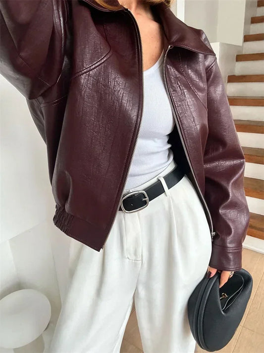 Autumn Lapel PU Outwear Female Zipper Pocket Fashion Patchwork Long Sleeve Solid Streetwear For Women Cropped Jacket Top