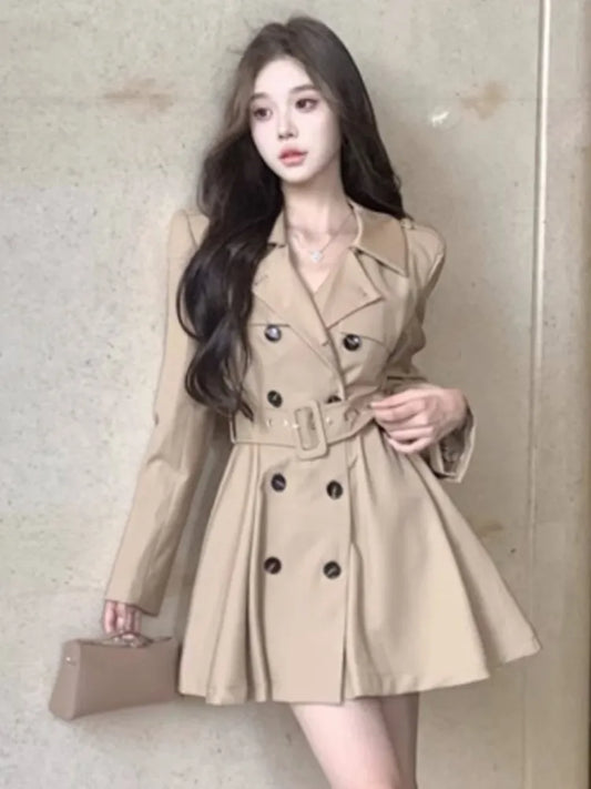 Autumn New Korean Chic Elegant Trench Coat Dresses for Women with Belt Turn-down Collar Double Breasted Casual Female Clothing