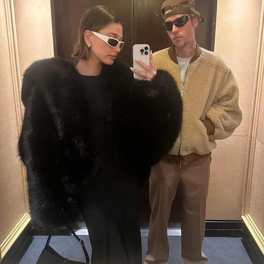 Brand Runway Fashion Iconic Hooded Batwing Faux Fur Coat Women Chic Winter Hailey Bieber Shaggy Overcoat Fox Fur Jacket