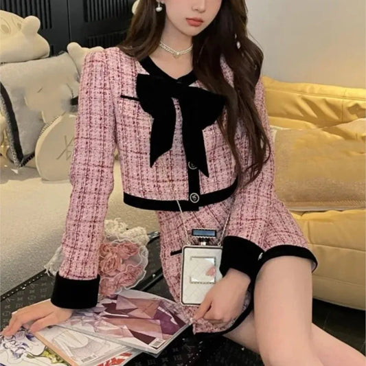Autumn Winter Tweed Two-Piece Skirt Set Women Short Jacket Coat + Mini Skirt Suits Elegant Korean Fashion Female Outfits