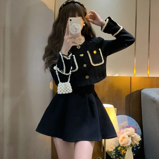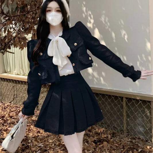Autumn New Elegant Two-Piece Skirt Sets Women Korean Fashion Chic Crop Jacket Coat Solid Mini Skirt Female Clothing Y2K Outfits