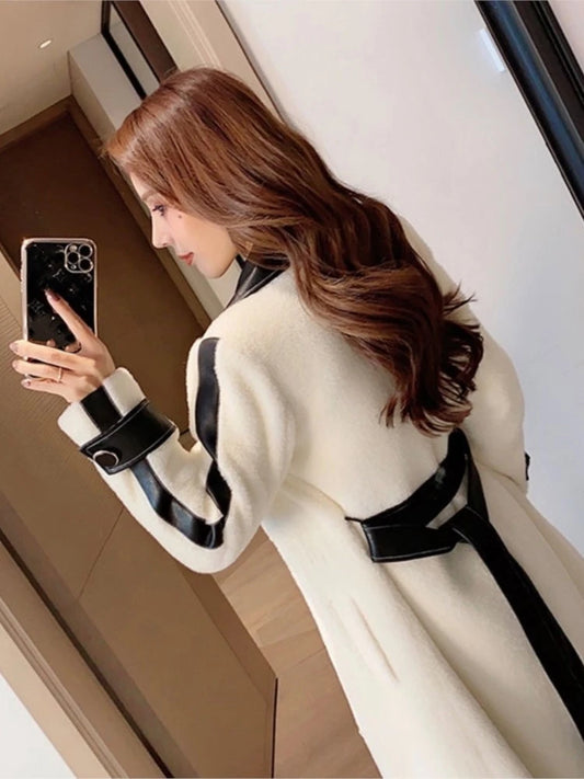Autumn Winter Chic Woolen Coat Women Patchwork Long Jackets with Belt Lapel Korean Fashion Female Outerwear New Soft Overcoat