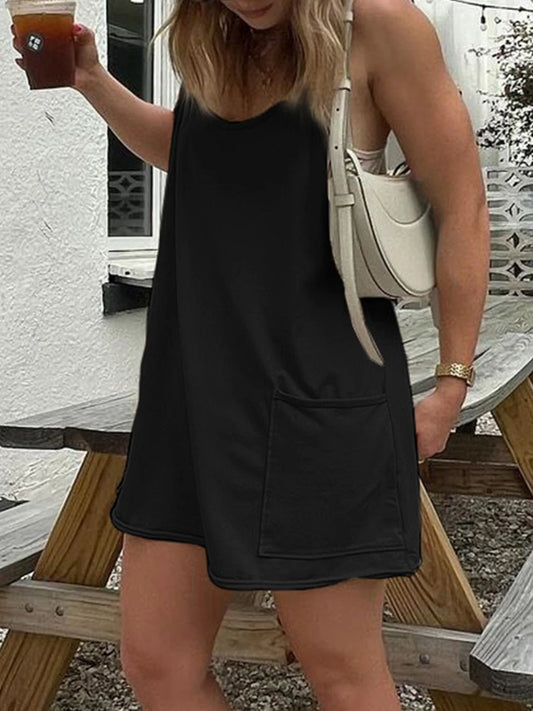 Black Solid Two Layers Wide Leg Rompers Womens Summer Vacation Casual Loose Sleeveless Dress Playsuits