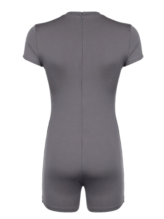 Back Zip Up O Neck Short Sleeve Skinny Sexy Gray Playsuits For Women Black Solid Basic Casual Sports Summer Rompers