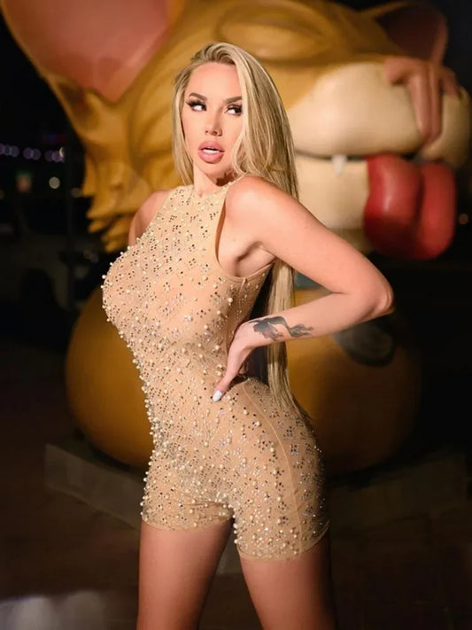 Bodycon Rompers Beading Playsuit Women Y2k Clothes Sleeveless Combinaison Femme Sexy Bodysuits O-Neck One Piece Club Outfit