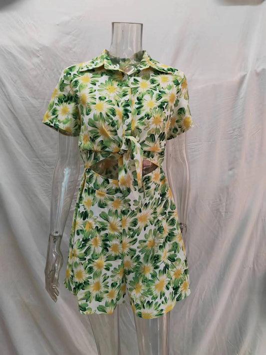 Women Summer Vacation Floral Short Sleeve Tie Rompers