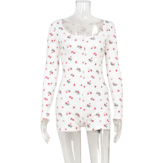 Spring Home Casual Floral Printed Square Collar Long Sleeve Jumpsuit Romper
