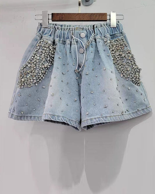 Retro Hot Rhinestone Curled A-Line Wide-Leg Shorts