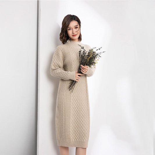 Autumn Winter Half High Collar Sweater Women Knitted Dress Mid Length Loose Over Knee Thickened Base Non Slit Woolen