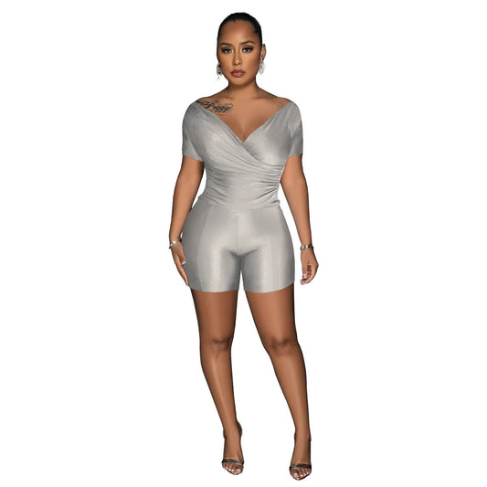 Conjunto de dos piezas de blusa y pantalón con cuello en V plisado reflectante de color liso para mujer