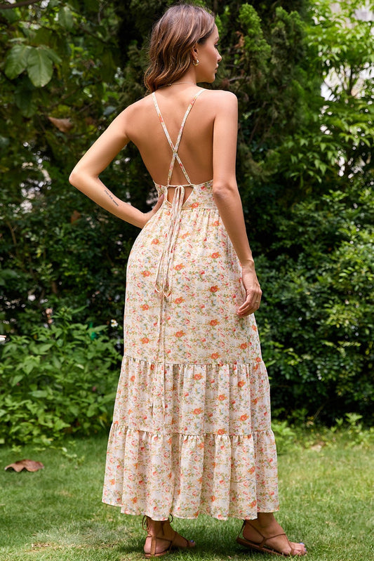 Vestido largo festivo plisado con tirantes y lazo en la espalda y estampado botánico
