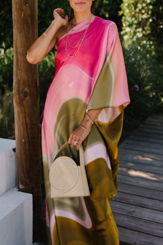Vestido largo asimétrico con cuello vuelto y estampado informal