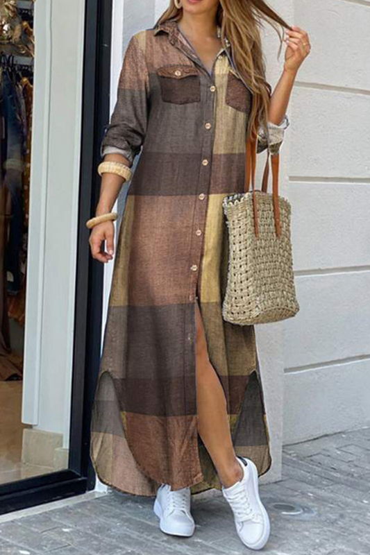 Vestido informal de cuadros con bolsillos y hebilla, cuello camisero, corte A (4 colores)
