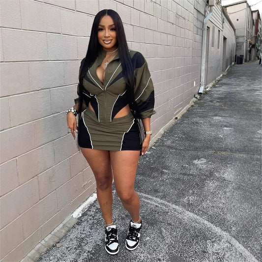 Conjunto deportivo sexy de otoño para mujer, holgado, informal, con contraste de color, de manga larga y abrigo, falda