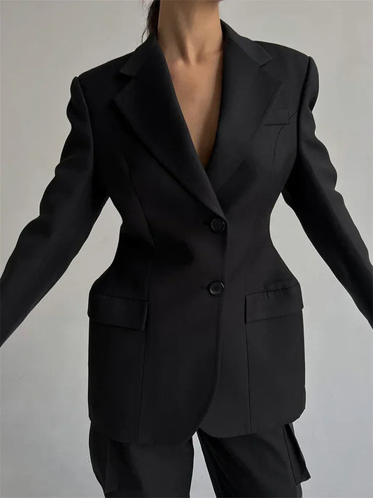 Traje de solapa negra para mujer, abrigo elegante de manga larga con bolsillos y retazos, blazer de cintura alta para otoño 2025
