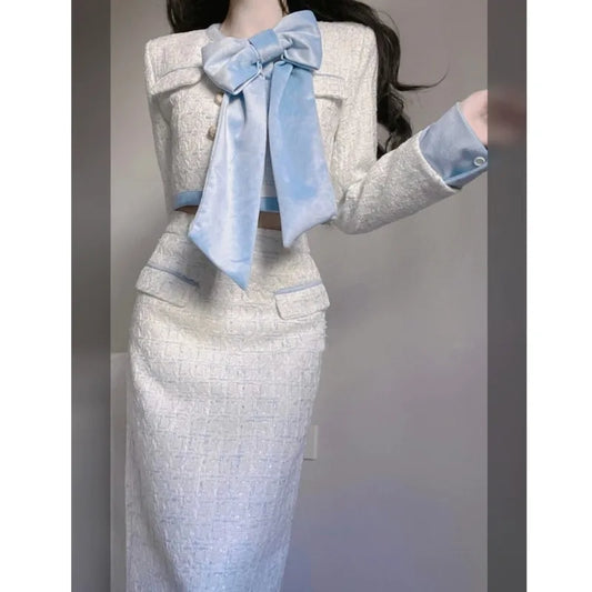 Conjunto de dos piezas elegante de moda coreana para otoño e invierno, chaqueta corta, abrigo, falda midi de cintura alta, conjuntos de lujo.