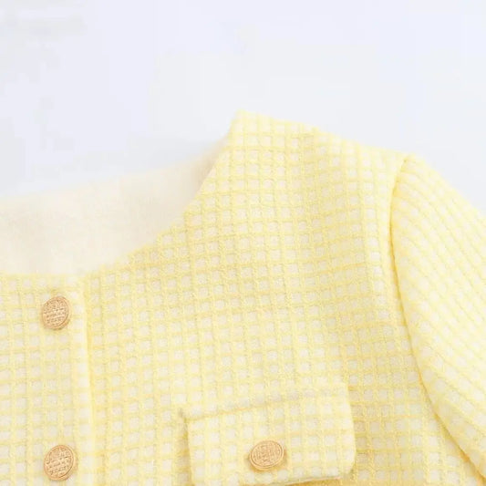 Abrigo de tweed a cuadros amarillo con cuello redondo para otoño, chaqueta corta vintage con bolsillos delanteros y botones dorados para mujer, chaqueta elegante