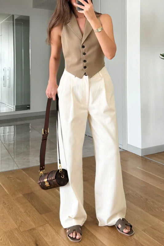 Chaleco informal con botones sólidos, pantalones, cuello en U, sin mangas, dos piezas (4 colores)