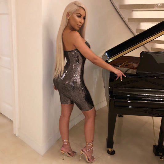 Mono sexy de fiesta con escote tipo bandeau, cremallera, corte entallado, de tela artesanal, sin espalda