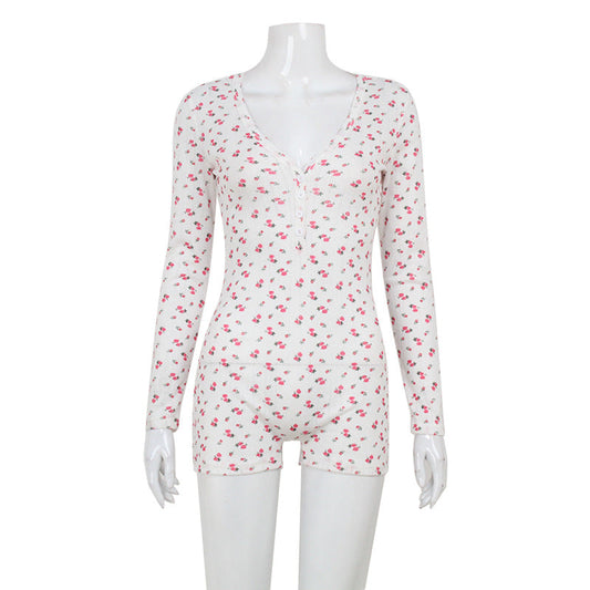 Mono de manga larga con estampado floral y cuello en V, sexy y ajustado para estar en casa para mujer