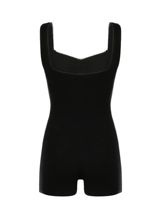 Mono de verano ajustado sin mangas con cuello cuadrado y fruncido para mujer, mono negro liso sencillo básico informal para vacaciones