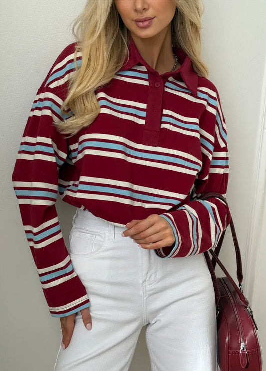 Striped Cotton Polo Long Sleeve Top - Casual Loose Fit