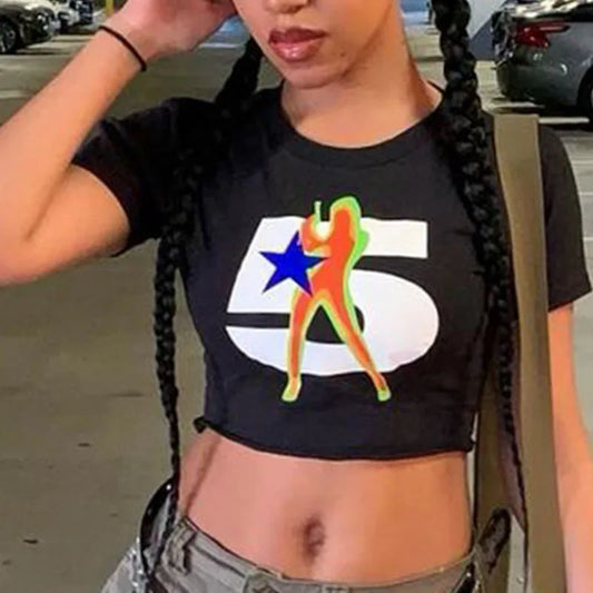 Camiseta de mujer con estampado digital de verano Y2K, estilo urbano, corte entallado y ombligo abierto.