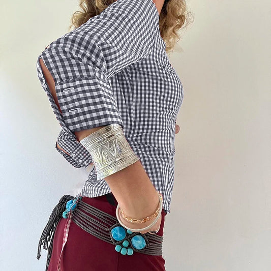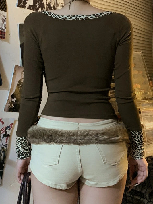 Tops irregulares retro de moda Y2k para mujer, camisetas de manga larga con parches de leopardo, cuello cuadrado, botones, elegantes y rasgadas