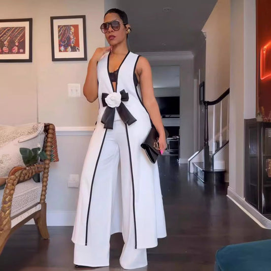 Conjunto de chaleco largo sin mangas con lazo de camelia sexy para mujer, pantalones de pierna ancha