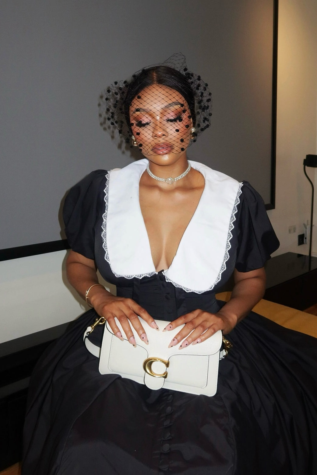 Cuello con cordones, detalle de botón falso, manga abullonada, largo midi.