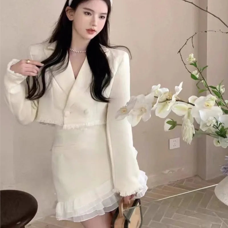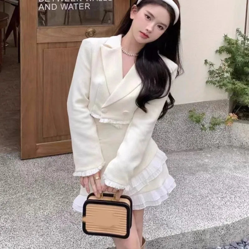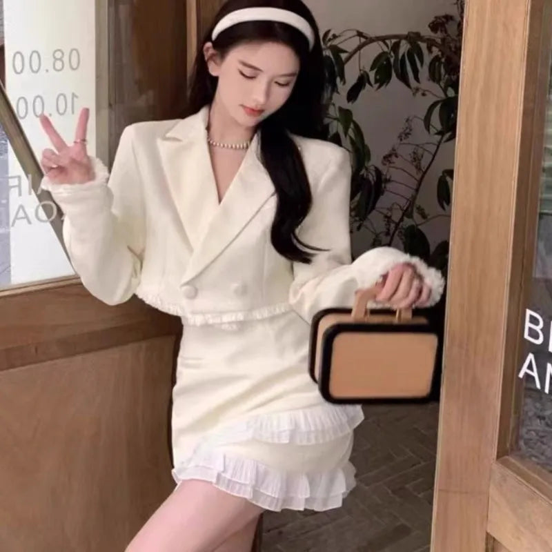 Conjunto de falda de dos piezas de lujo para mujer, chaqueta corta con solapa y volantes, minifalda ajustada de retazos, moda coreana, otoño