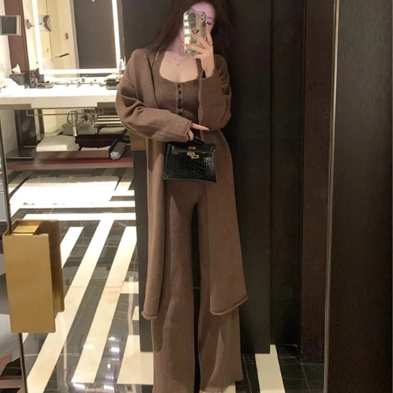 Conjunto de 3 piezas de punto para mujer, chaleco con cuello halter, cárdigan largo, pantalones largos, ropa informal lisa de moda coreana, otoño e invierno, nuevo