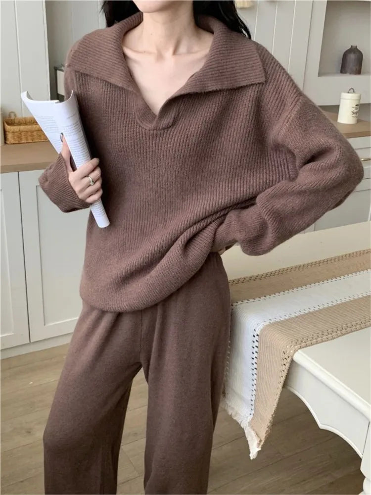 Conjunto de dos piezas de punto para mujer, jersey de solapa, pantalones largos, moda coreana, ropa informal para mujer, prendas de punto nuevas