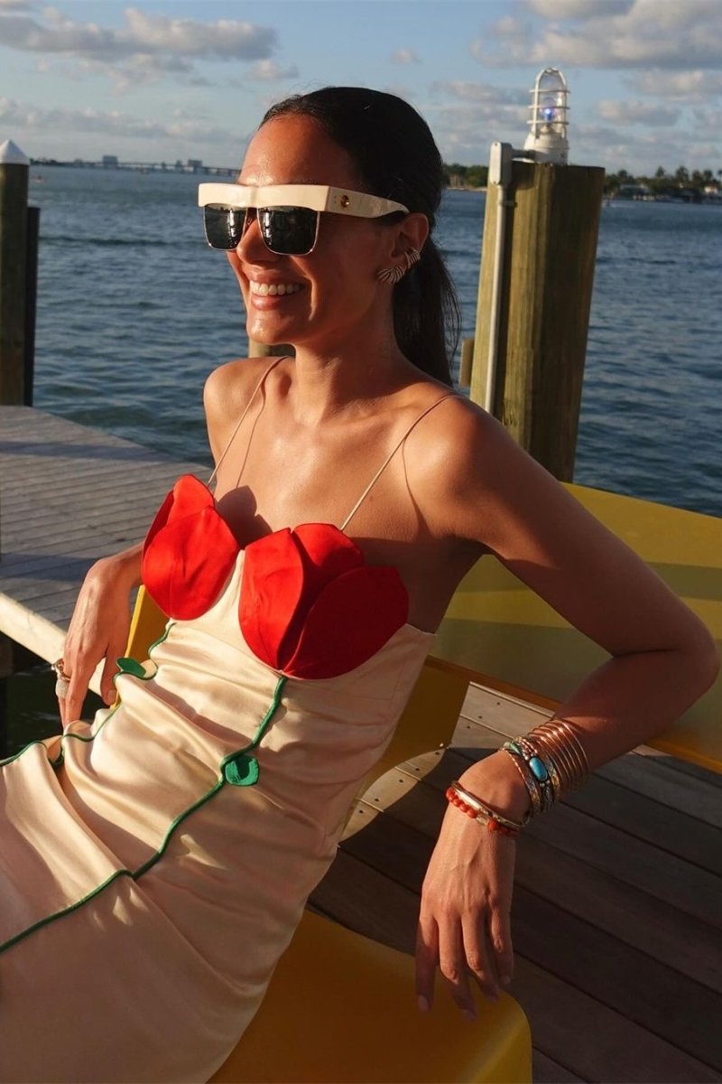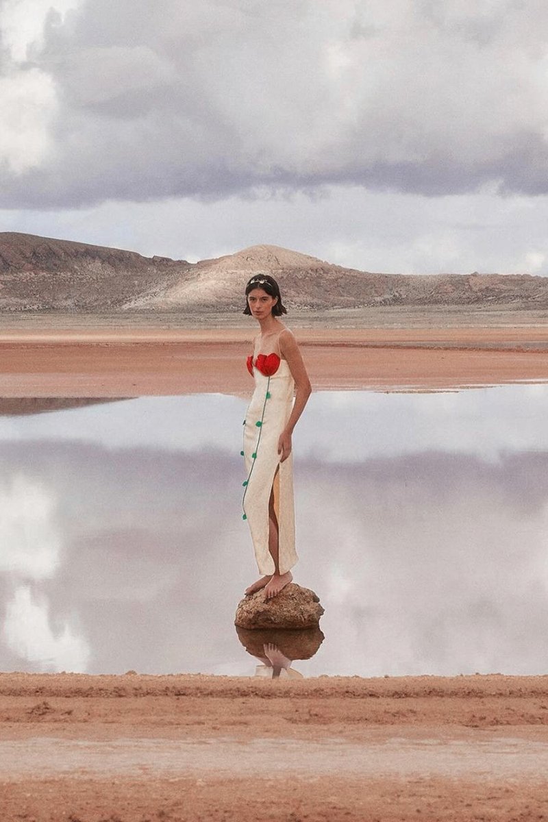 - Aberturas laterales profundas, tirantes finos ajustados, detalle de rosa, largo máximo.