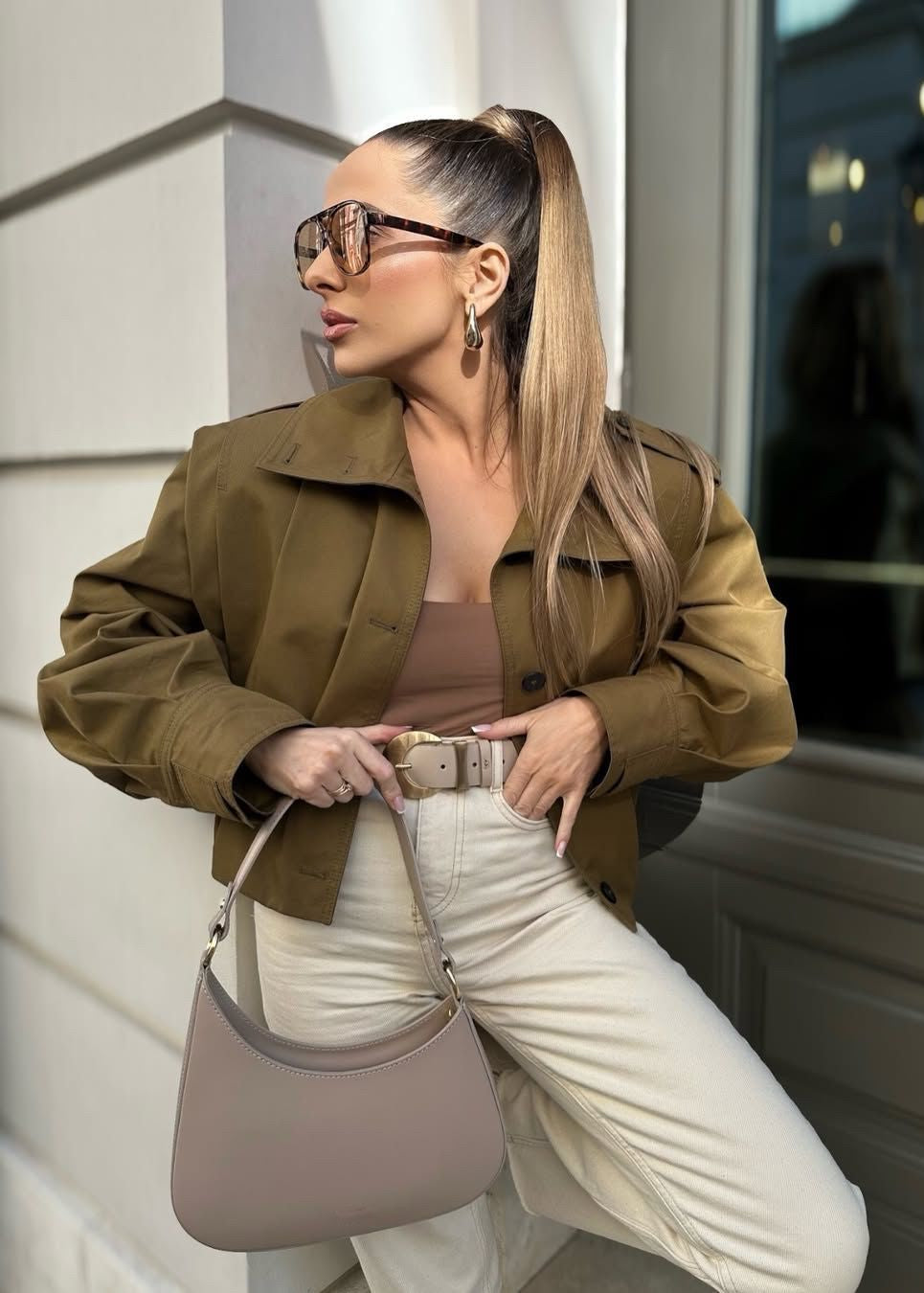 Cropped Button-Up Jacket with Epaulettes – Khaki
