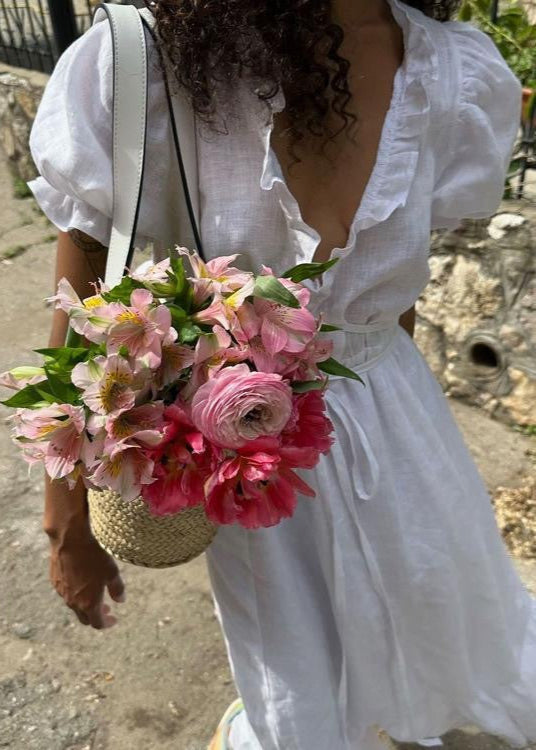 The Ivory Grace dress combines soft linen texture with feminine structure for an effortless warm-weather look. Designed with gently puffed sleeves, a ruffled neckline, and a wrap-style tie waist, this piece flatters while offering comfort. The midi length and flared hemline give it graceful movement, ideal for brunches, garden parties, or beachside dinners.