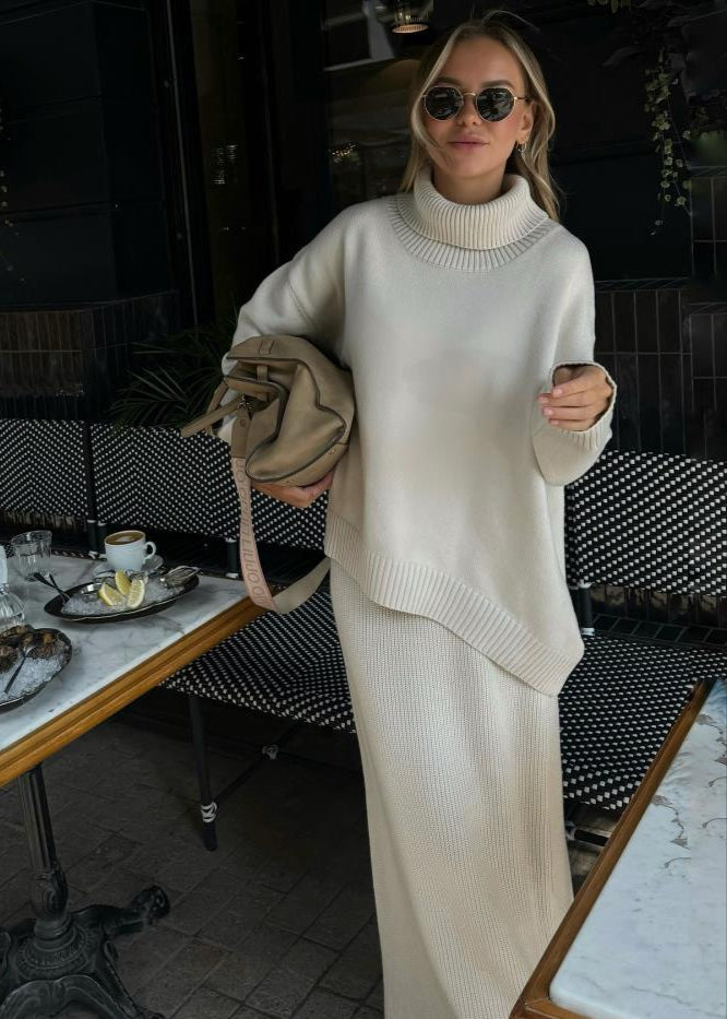 The Lorienne two-piece set redefines cold-season comfort with effortless sophistication. This relaxed knit combo features an oversized turtleneck sweater with dropped shoulders and ribbed detailing, paired with a straight-cut maxi skirt in a matching soft-touch texture. The coordinated neutral palette makes it easy to mix and match with boots, sneakers, or heels, while the breathable knit offers warmth without weight. Whether you’re headed for a weekend brunch or a cozy evening walk, this set delivers relaxed polish in one go.